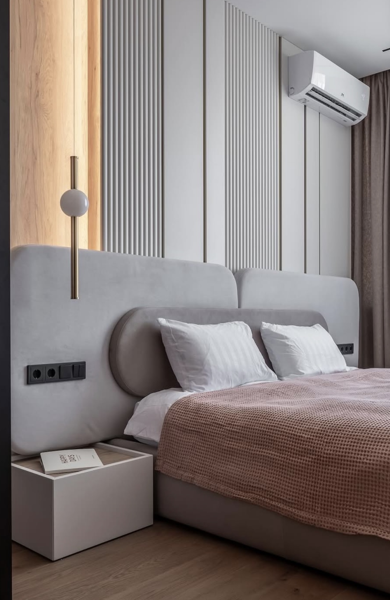 И самое востребованное — встроить прямо в изголовье розетки (для зарядки телефона, ночника), выключатели основного света и бра для чтения. Больше никаких удлинителей и проводов под подушкой.