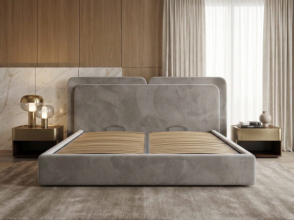 1. Подъёмный механизм на газлифтах — плавно поднимаете основание, под ним глубокий отсек для одеял, подушек, чемоданов.